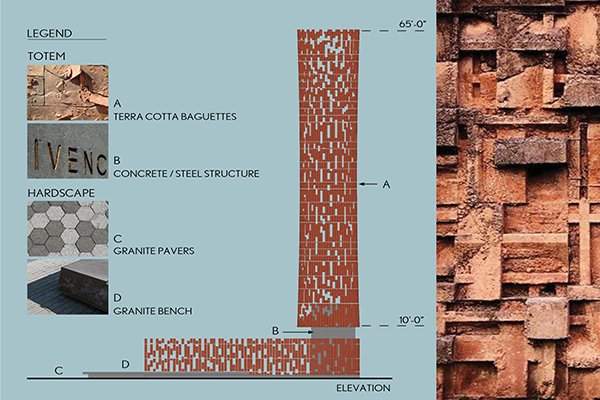 Tótem de Unidad is meant to be experienced from within. The lattice extending from the base embraces the “sanctuary” of the structure and guides visitors inside. A curved sleeve anchors the tótem to the site and serves as a tablet for inscription. The terra cotta exterior becomes more open as the tótem ascends, allowing natural light to emanate through gaps between the panels and draw a visitor’s eye upward — conceptually uplifting one’s spirit. A bench at the end of the lattice provides a place to pause or leave flowers.