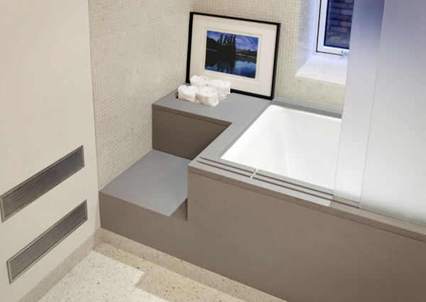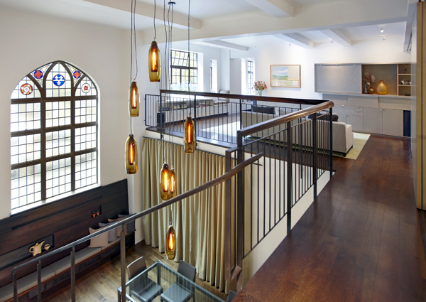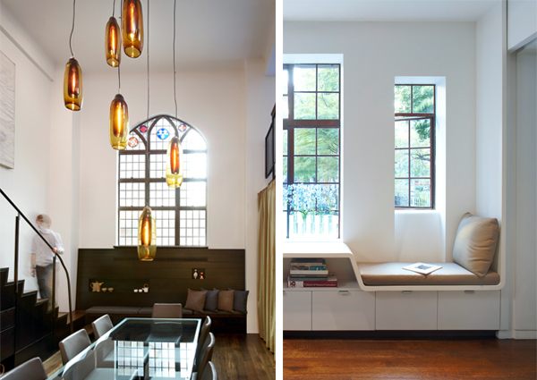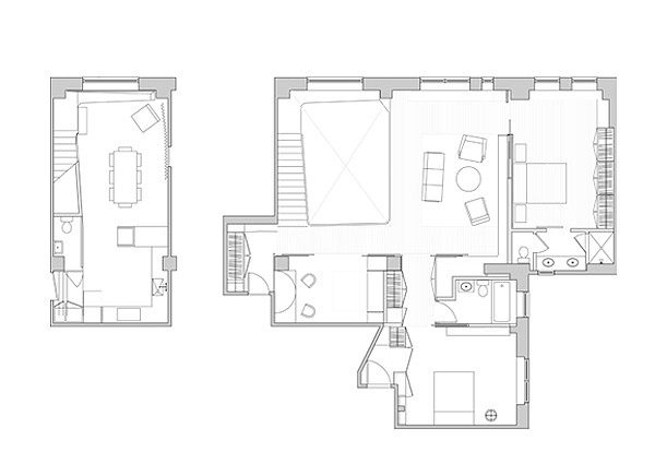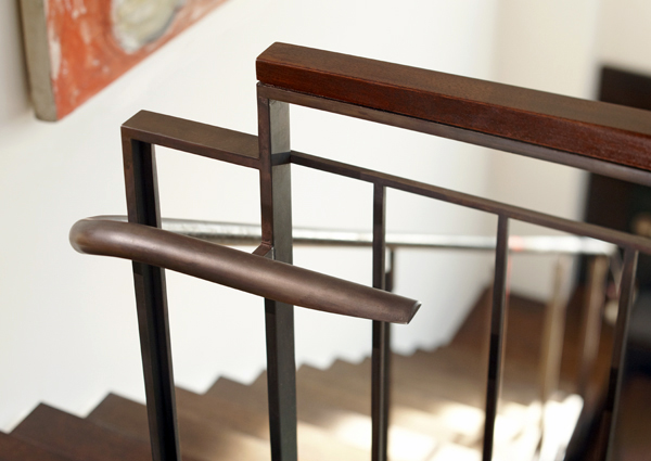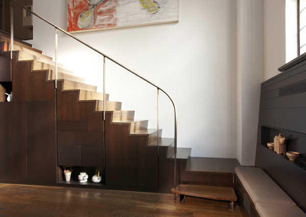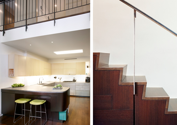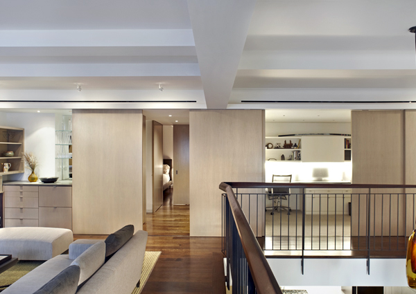 This residence on Gramercy Park North is the result of a brick-to-brick conversion of a 1920s doctor's office duplex. The ground level entrance foyer possessed a 22-foot high ceiling with a narrow footprint. The remainder of the lower and upper spaces were divided into a network of many rooms and corridors. Through the design program, the entire interior was removed to open up the interlocking levels. A ribbon of stairs, hand-blown glass light fixtures and patina steel handrails now connect the ground floor kitchen and dining areas to the living room above. A series of sliding doors and built-in storage millwork act as a buffer for both bedrooms (and accompanying bathrooms) as wells as a two-person office that can be transformed into a guest bedroom when needed. Finishes, hardware, lighting, mechanical cooling systems and crafted materials help create a sense of calmness that prevails as a platform for viewing the lush Gramercy Park landscape.